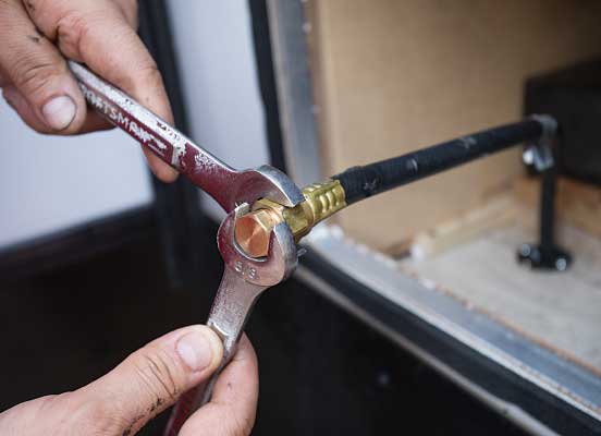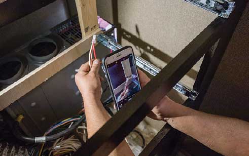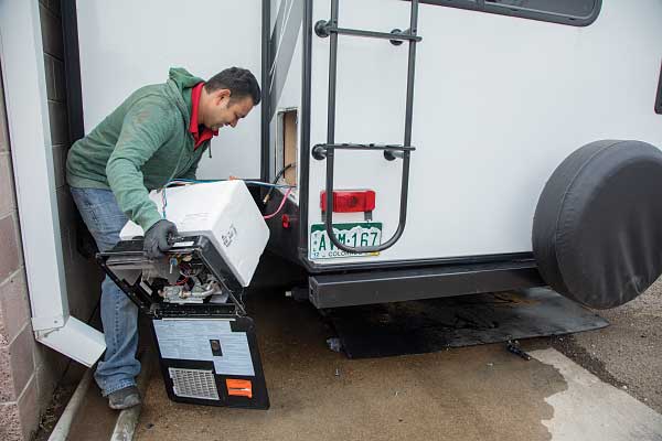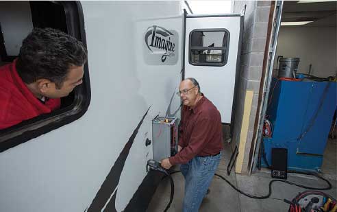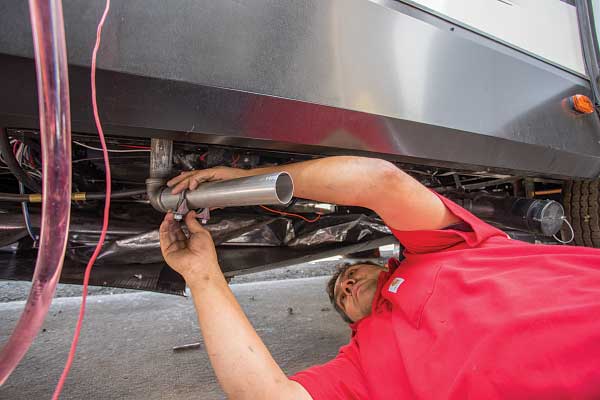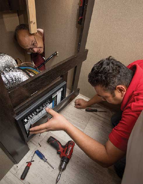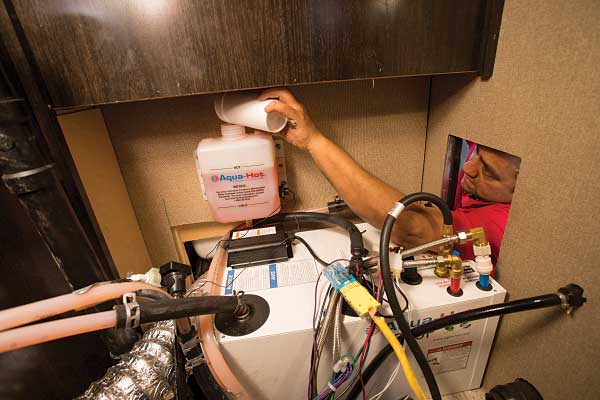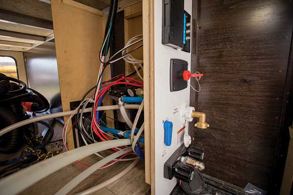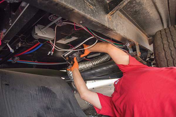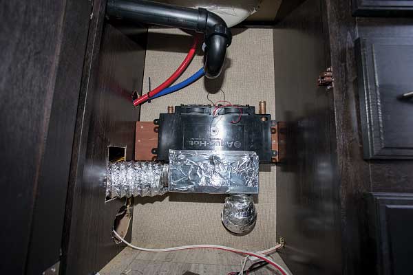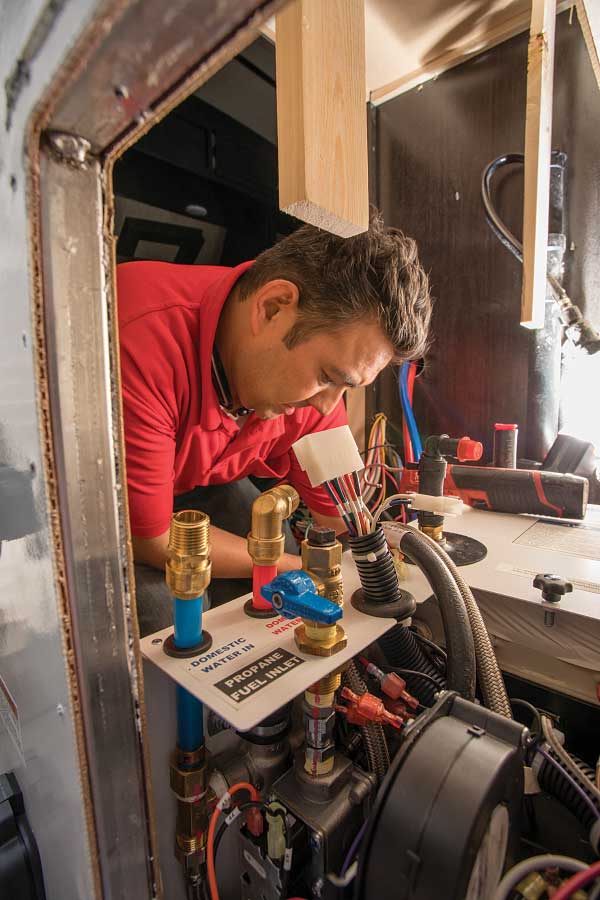 Once the hole in the flooring of the trailer for the unit’s exhaust manifold was cut, the technician spliced into the potable water lines and connected them to the new system, which are on top for ease of installation. A reservoir mounted on the wall above the system will make it easy to top off the heating system antifreeze fluid through the exterior-access panel. An exhaust pipe was dropped down with an elbow, sending the heat from the unit out the side. Because the system runs on propane or electricity, no smell or smoke is discharged.