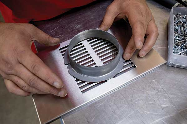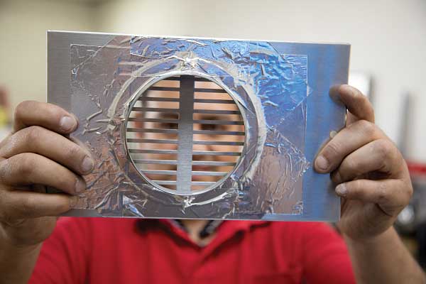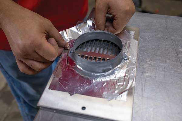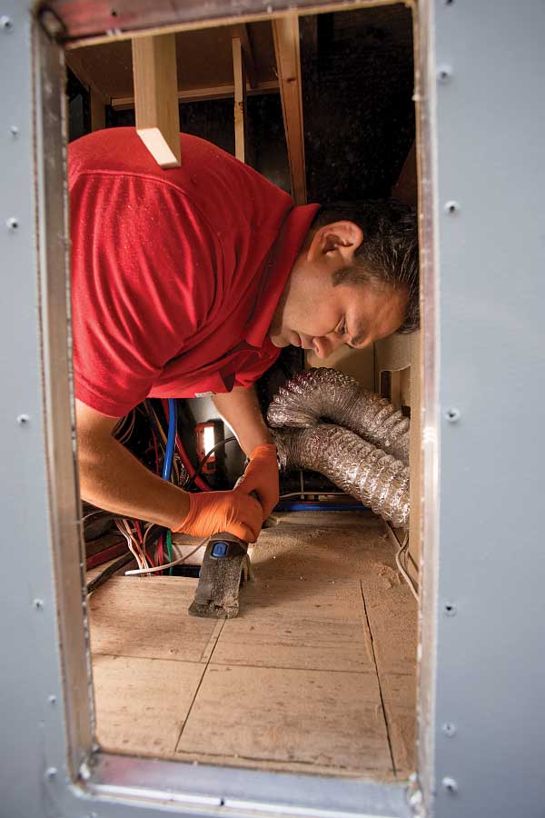 After mounting the heat exchanger in the water-heater opening, a vent passage to heat the primary living space was cut. Additional exchangers were placed beneath the kitchen island, in the primary living area, and inside the bathroom to heat it and the bedroom. One heat exchanger was mounted in the front storage bay to keep it and the entry point for the water systems warm. A direct connection was established from the heat exchangers to the vents, plus the existing ductwork, to move heat throughout the trailer.