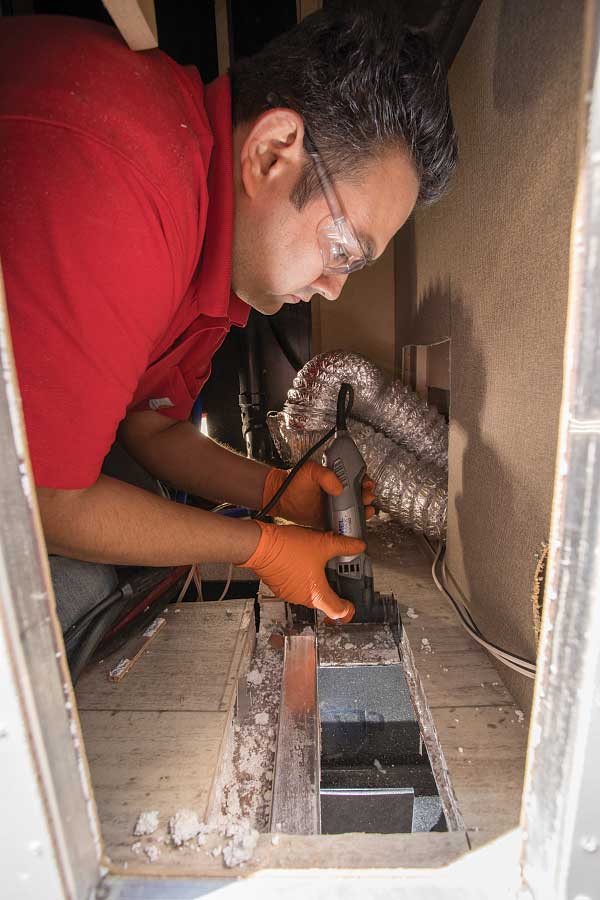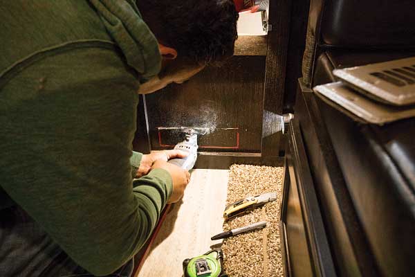 For the installation, the drawers and cabinet facing covering the Imagine’s original forced-air furnace were pulled out. From there, the original LP-gas furnace was quickly removed.