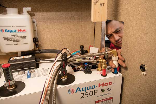 Labor can range from $1,000 to $5,000, according to Carrillo, with the final cost being determined by the length of the trailer or fifth-wheel and number of heat exchangers required. Owners will be encouraged to send photos and any wiring diagrams they have to determine the installation cost estimate. Aqua-Hot has more than 200 authorized service centers with more than 800 certified technicians.