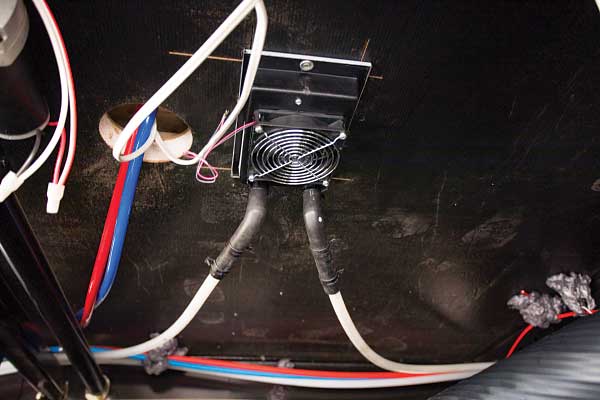The most labor-intensive part of the installation required dropping the underpinning beneath the trailer to run the plastic piping for the antifreeze and electrical wiring to operate the heat exchangers. Runs were made to each of the five heat exchangers, which consist of a combination of the two-fan, 8,200-Btu Cozy units and the smaller single-fan, 4,000-Btu Whisper units.
