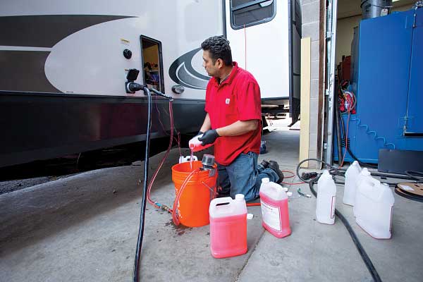 Make sure the antifreeze flows through both hot and cold lines, and that you get the washer and dryer hookups, outside shower and low-point drains flushed as well. There is no need to winterize or drain the antifreeze solution from the circulating system for the heat exchangers.