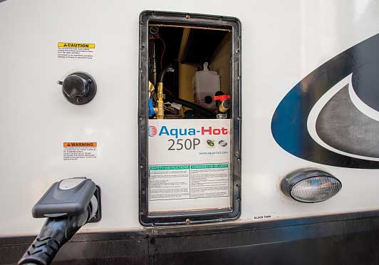 As the Aqua-Hot 250P went to work, the antifreeze mixture got up to its 190-degree Fahrenheit target within 10 minutes, before shutting down the LP-gas connection and using the electric element to maintain temperature. For daily dish- and handwashing, the electric element will be up to the job, requiring use of LP-gas only when taking showers or other high-use hot-water tasks.