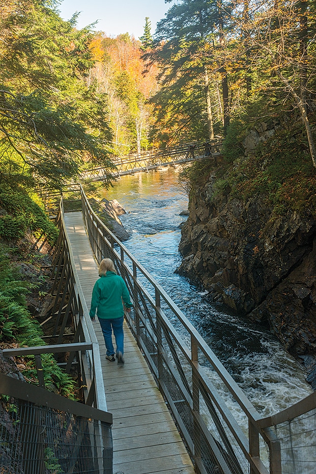 The following morning, we drove west on the Olympic Trail State Scenic Byway, Route 86, stopping at High Falls Gorge. After paying a fee of $13.95 per adult, which helps maintain the privately owned park, we walked across a footbridge and followed a short path to the river. The 30-minute walk on steel catwalks along the gorge, high above the raging Ausable River, is breathtaking. At the bottom of the gorge, we crossed the river on a steel bridge and enjoyed a view of the four linking waterfalls. In addition to the nature walk, visitors can pan for gemstones and fossils in the mining sluice.