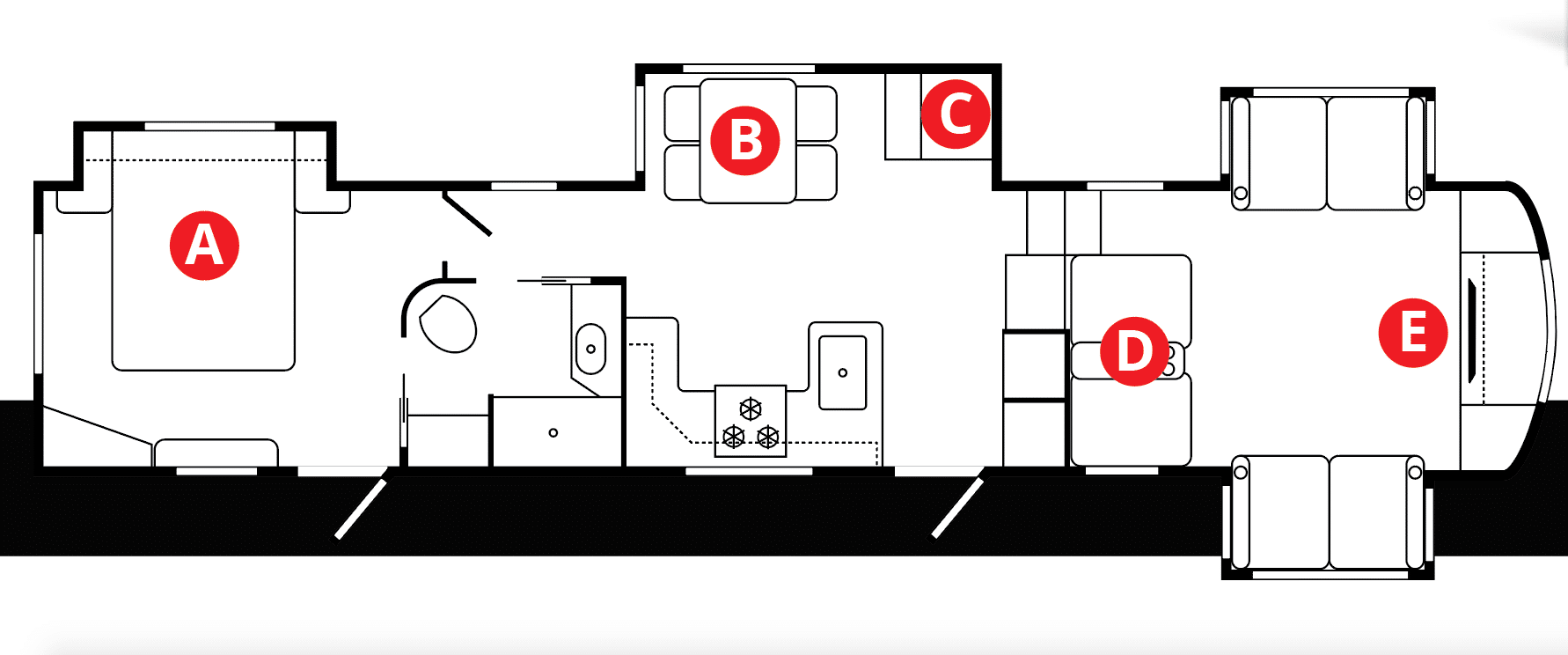 For those RVers in it for the long haul, the V3436FL fits the bill with extreme comfort, sleeping for six and a view outside no matter where you are seated inside.