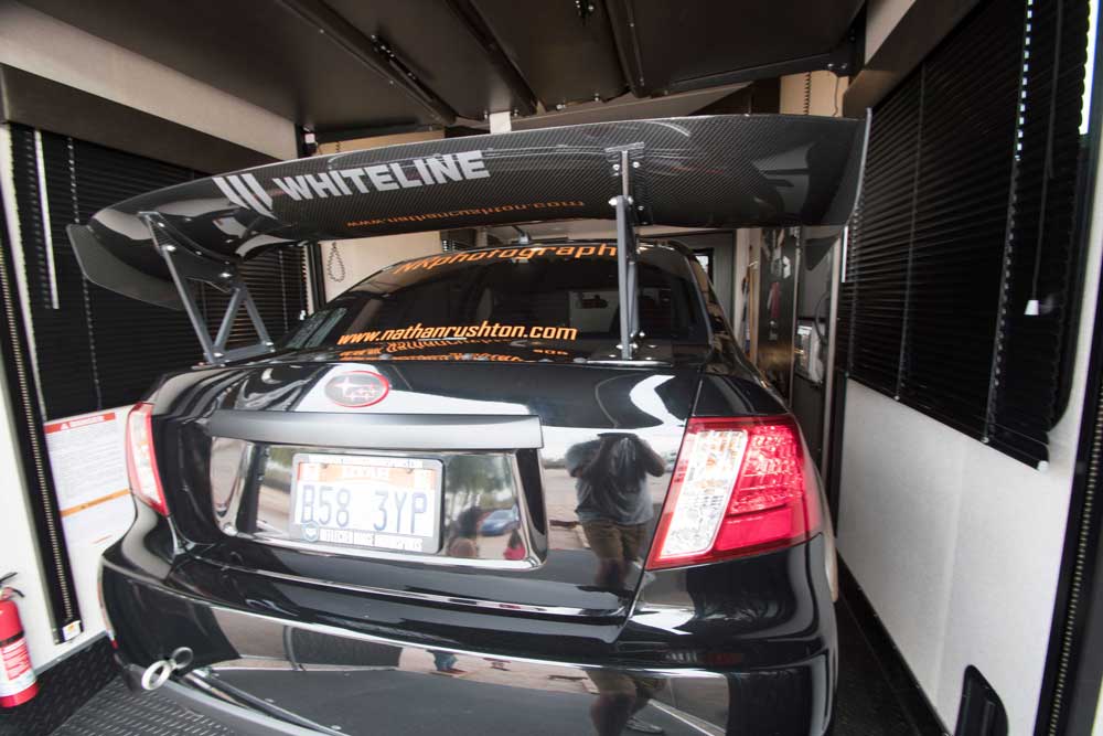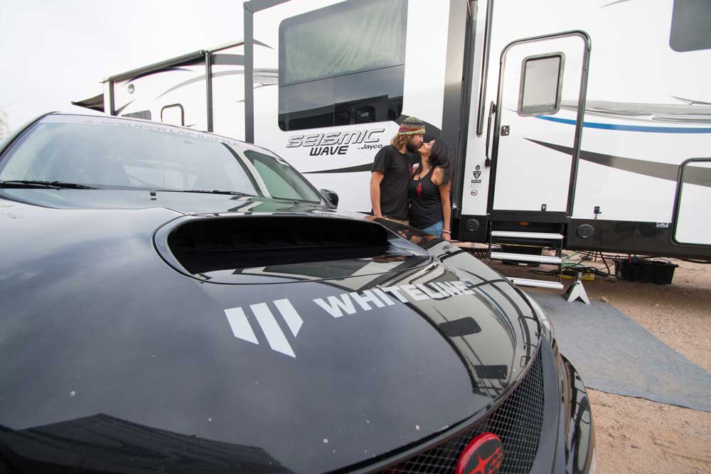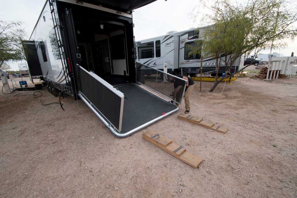 My husband and I decided to rent out our house in Utah and purchase a toy hauler so I could attend races, but it’s hard to find an RV that can accommodate a 15-foot car. Fortunately, our salesperson at Camping World found a 45-foot Jayco Seismic Wave 416W fifth-wheel that has a 16-foot-long garage, and the car fits like a glove.