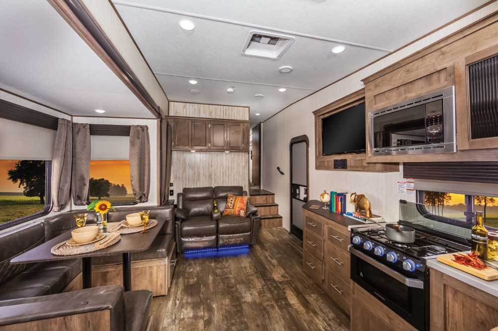 From Tiffin Motorhomes’ towable Vanleigh line, this triple-slideout mid-profile model captures the higher end features Tiffin is known for, such as R-40-insulated flooring and roof, an electric four-point auto-leveling system, and wood fascia and doors that are handcrafted in-house. Little touches like under-counter lighting on the solid-surface kitchen island, a roomy shower and optional memory-foam mattress make the Pinecrest an eye-catching possibility.