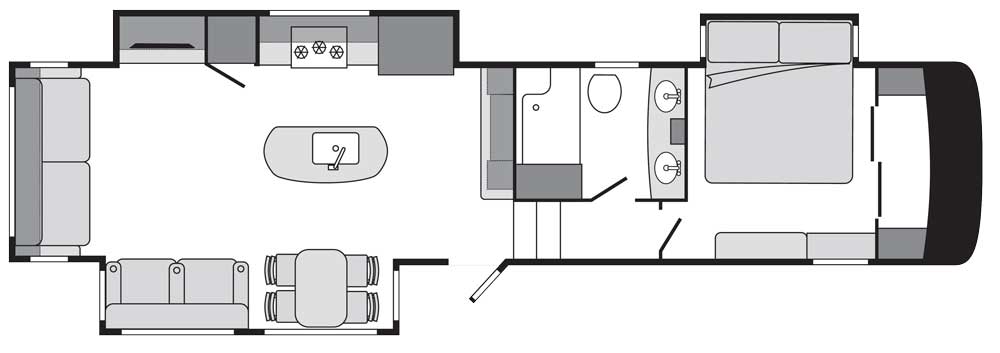 While this five-slideout floorplan only recently hit dealers’ lots, it’s already turning heads. The rear is dedicated to an indulgent master bath with a dual-sink corner vanity, a wardrobe with washer-dryer prep and lots of light from the shower skylight, ceiling-vent fan and window over the mirrored cabinets, of which there are many. And, no, the term “master bath” is not superfluous; there’s also a half bath off the kitchen. The 344FL is just as lavishly appointed everywhere else, but attention was also paid to practical matters such as a front cap designed to be shortbed-friendly and side walls with water-impervious Azdel composite material, plus bonus items like an outside refrigerator. At 41 feet, it’s in the higher size range of this collection, but not so in price.