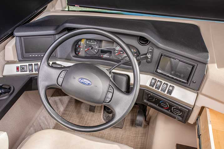 The nicely recessed Ford cluster is flanked by two flat screens. The left one monitors the side- and rear-camera system, while the right is the Kenwood eXcelon stereo. The center of the dash has a recessed tray on top with a large wood-clad hidden drawer beneath. A similar tray on top with a sliding table/computer workstation is fitted on the passenger side.