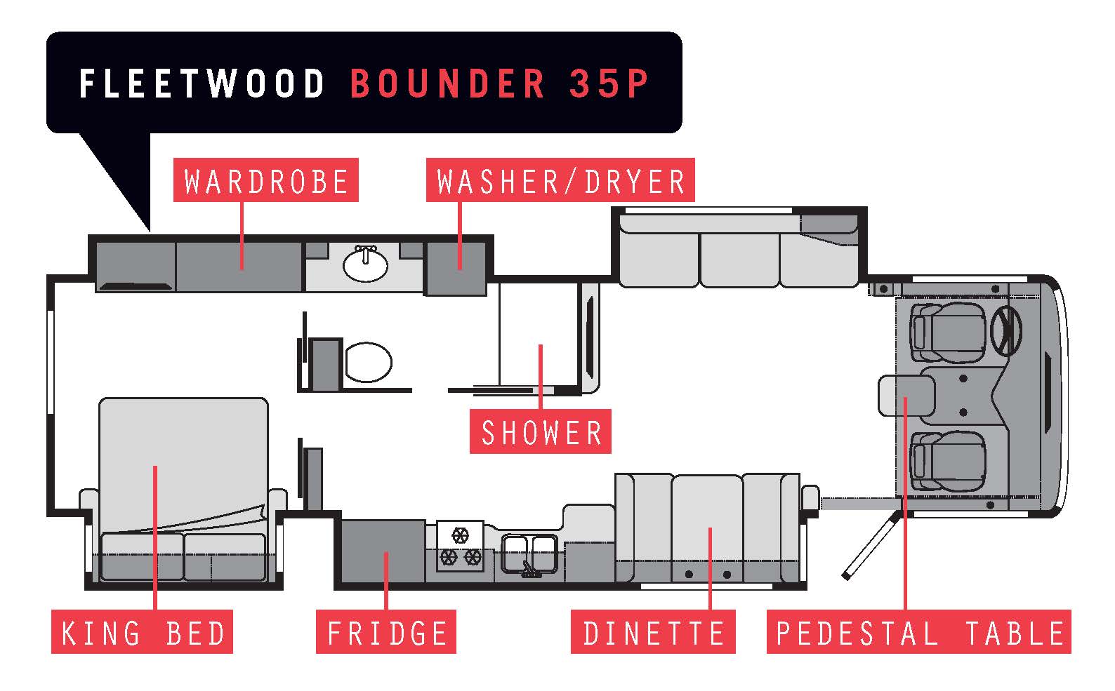 Built on Fleetwood’s Power Platform chassis saddle frame, the Bounder provides a well-balanced tank arrangement with an ultra-strong framework that permits excellent basement storage, all reached via side-opening slam-latch baggage doors.