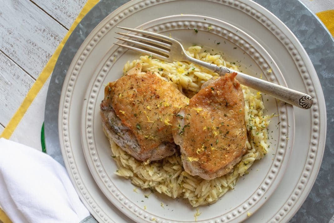 Carefully add in the chicken broth, dried herbs and lemon zest, stirring frequently. Bring to a simmer, then turn the heat to low and add the chicken thighs back in the pan along with the juices. Cook covered for 10 to 15 minutes, until the liquid is almost absorbed and orzo is tender. Remove from the heat; allow to rest for 10 minutes, still covered. Use a thermometer to test the chicken for doneness (165 degrees), taste for seasoning, and add salt and pepper if needed.