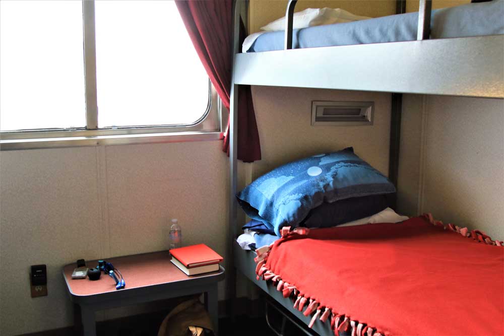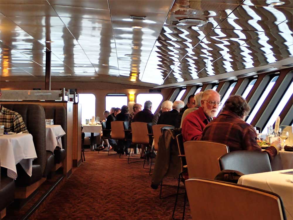 Passengers are prohibited from sleeping in their vehicles, so we’ve booked a four-berth cabin. Besides bunks, the cabin offers a sink, shower, toilet, closet area and large window. We stash our gear and head up to an observation deck. As the ferry smoothly pulls away from the dock at 6 p.m., a harbor seal bobs in the water, and a great blue heron floats by.