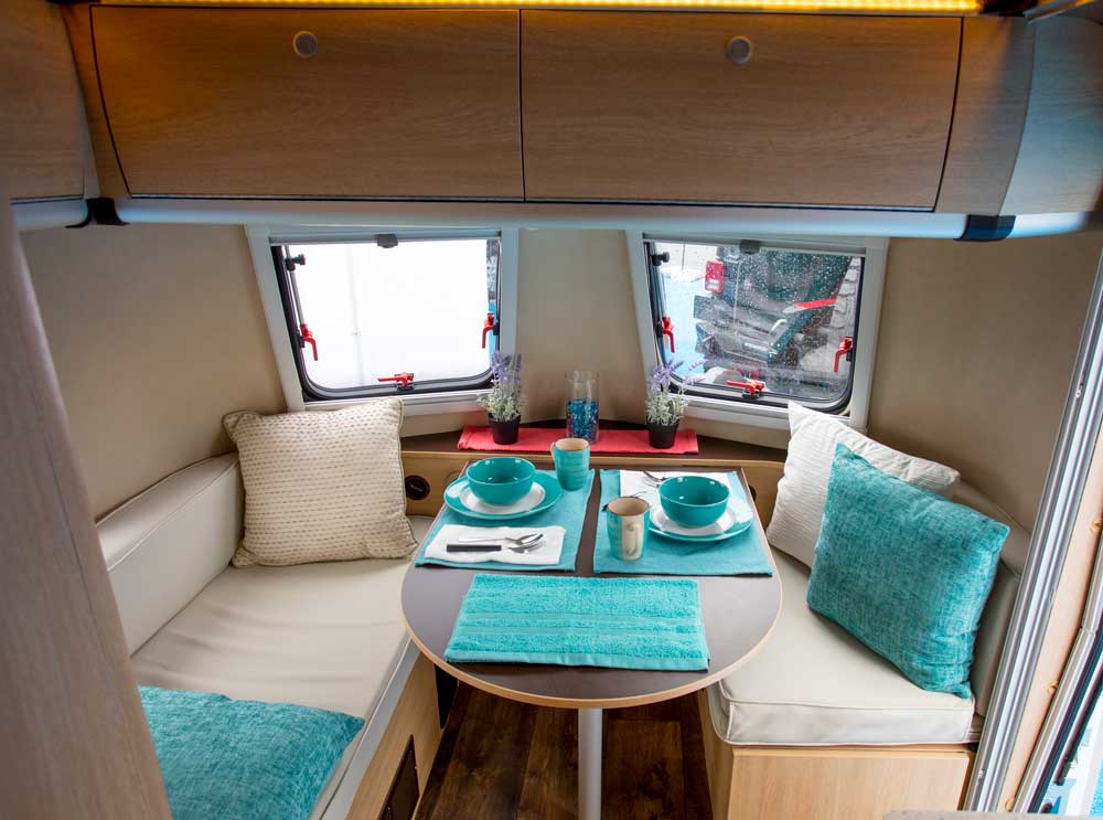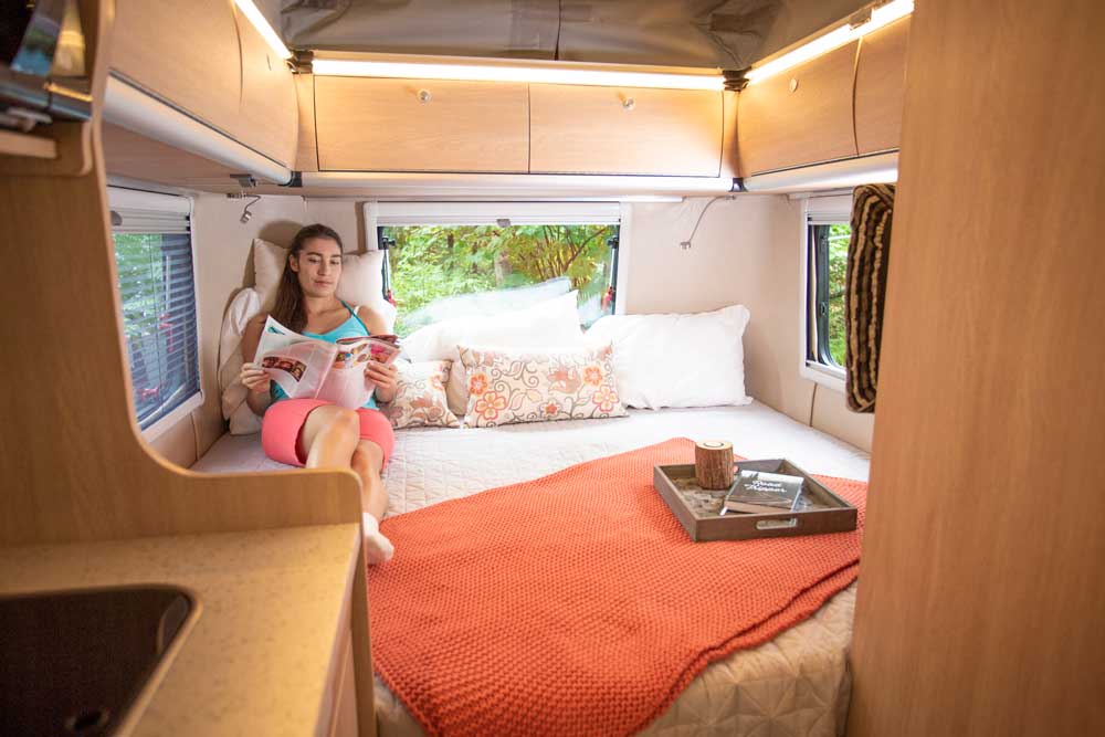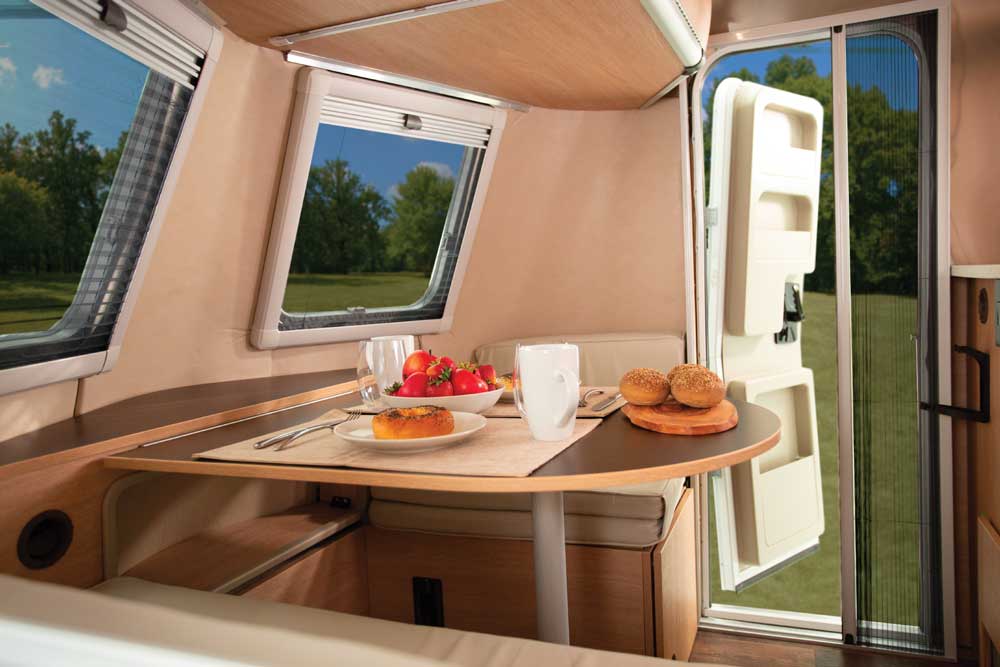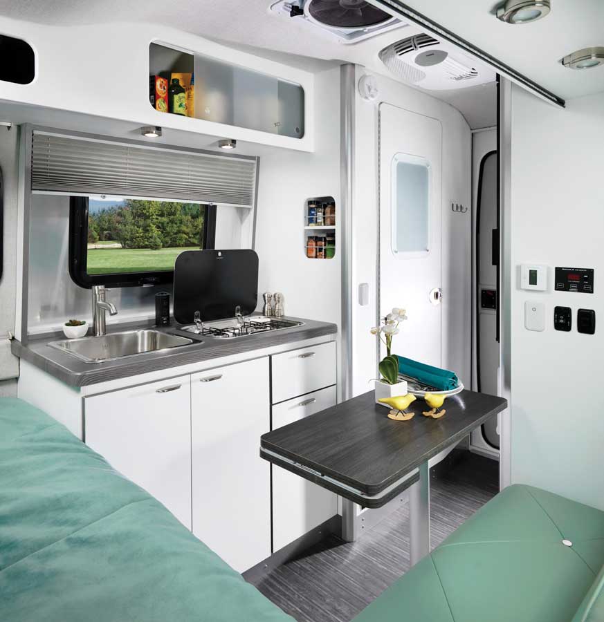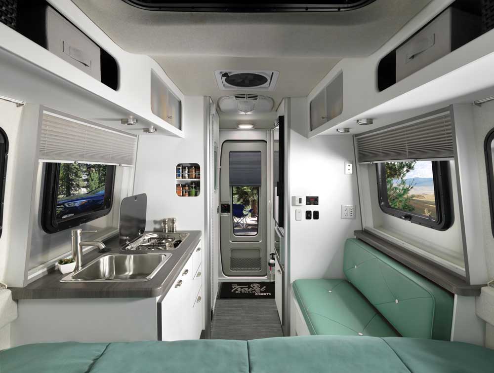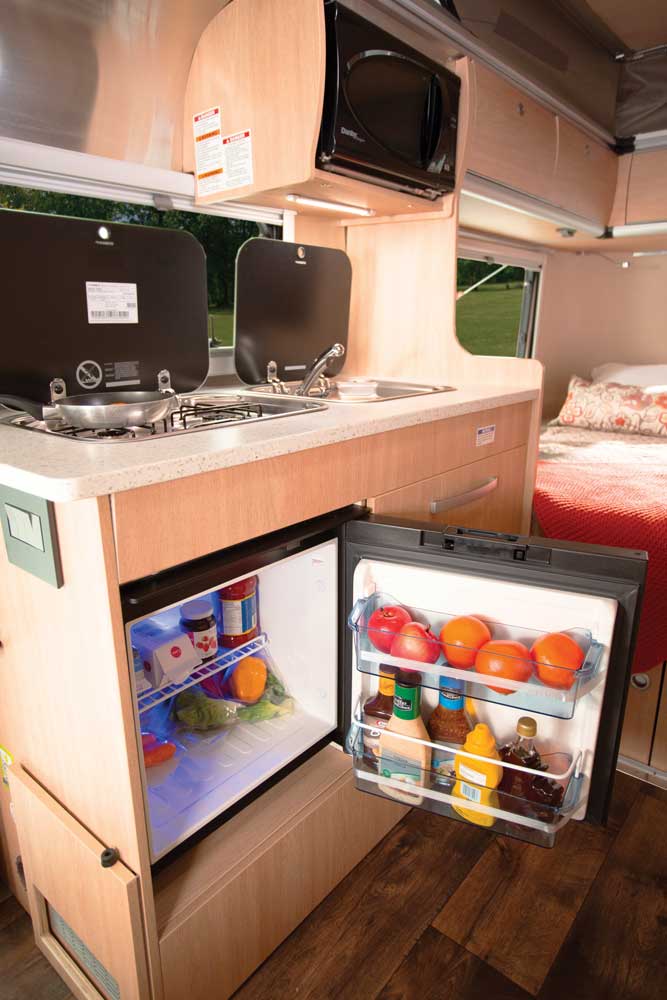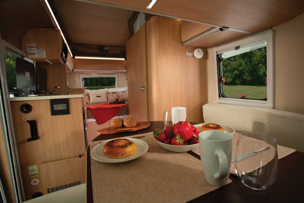 The midship kitchen comes with an under-counter two-way refrigerator, a two-burner propane stove and a single-basin sink (a microwave is optional), and the wet bathroom has a cassette toilet. A propane-powered Truma Combi Eco system supplies heating and hot water, while eight dual-pane windows help keep the cold out. MSRP starts at $26,460.