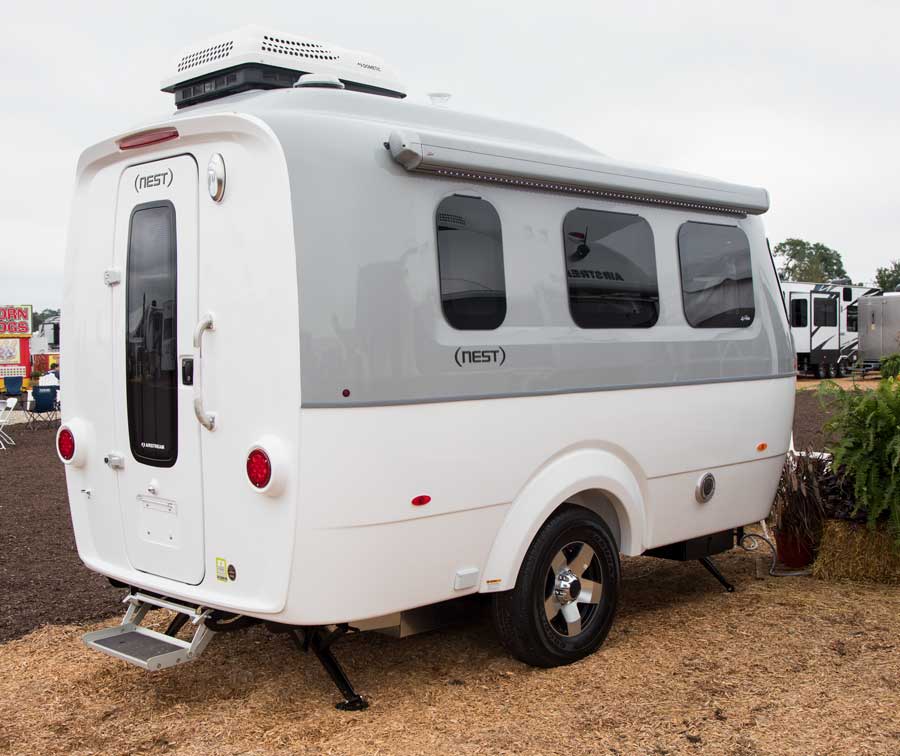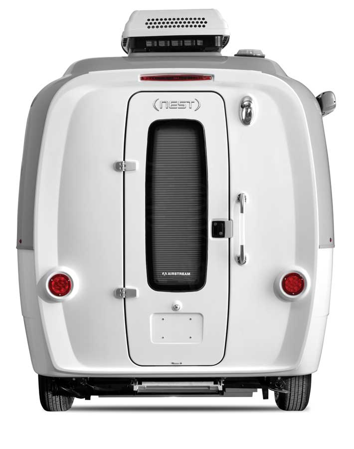 The Nest line, which features two 16-foot, 7-inch floorplans, has a full-fiberglass clamshell design with a unique rear-wall entry. While the interior is compact and efficient, it still offers the sort of high-end appeal common to Airstream’s aluminum-clad trailers.