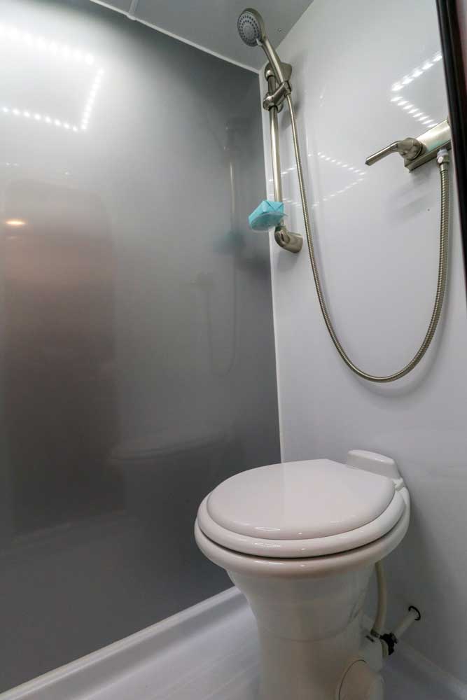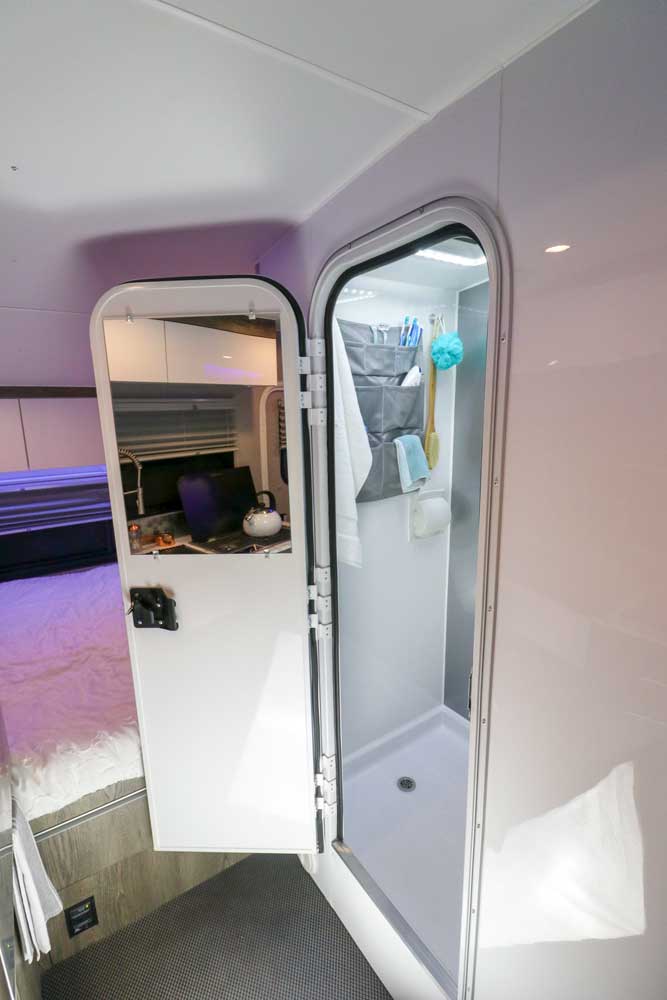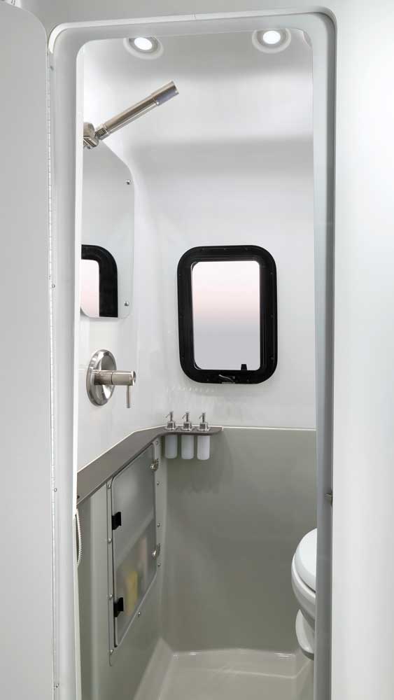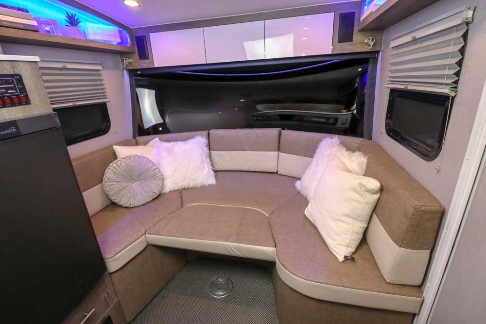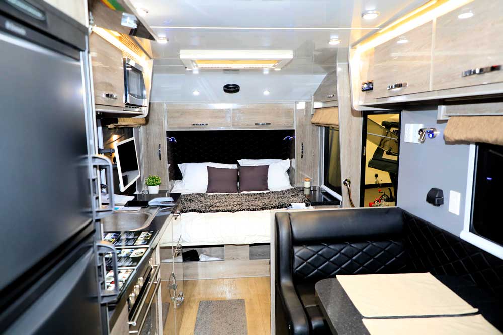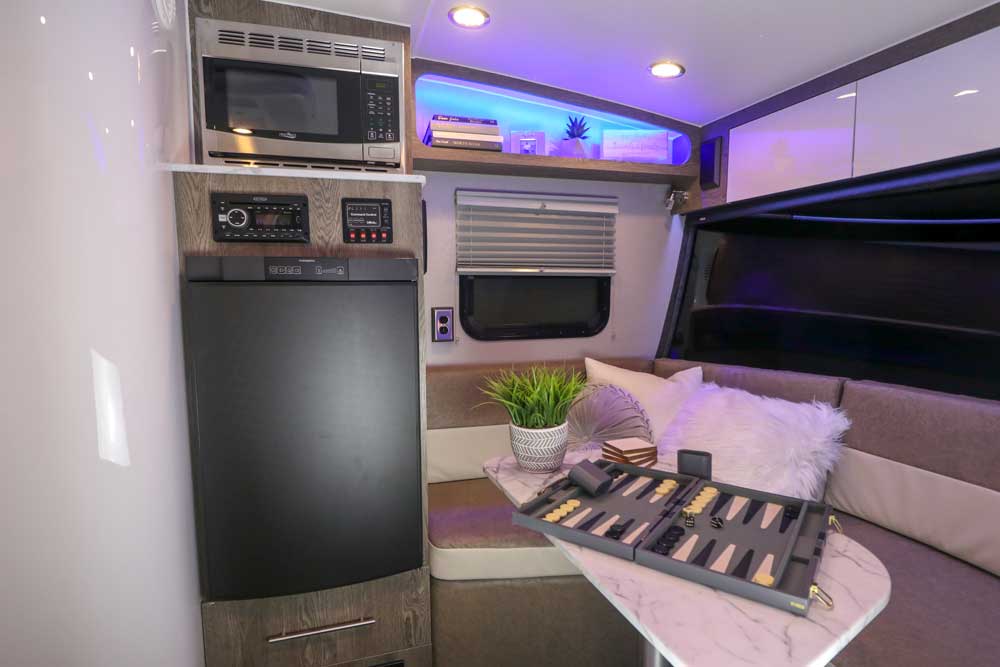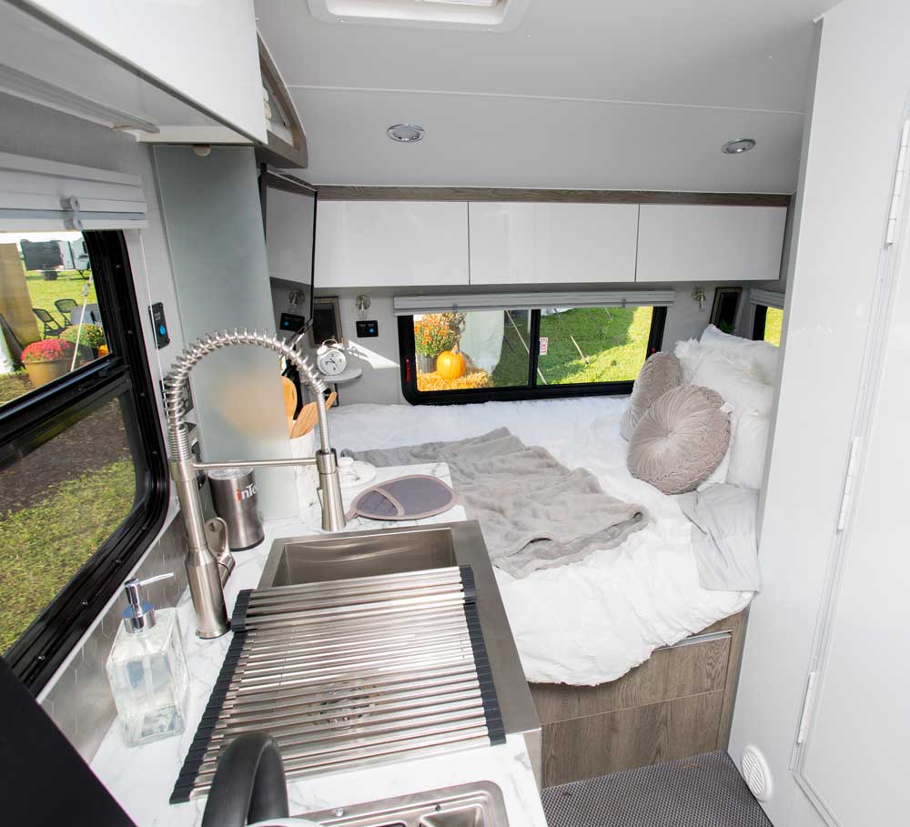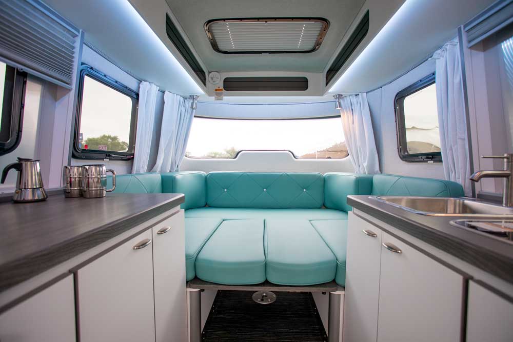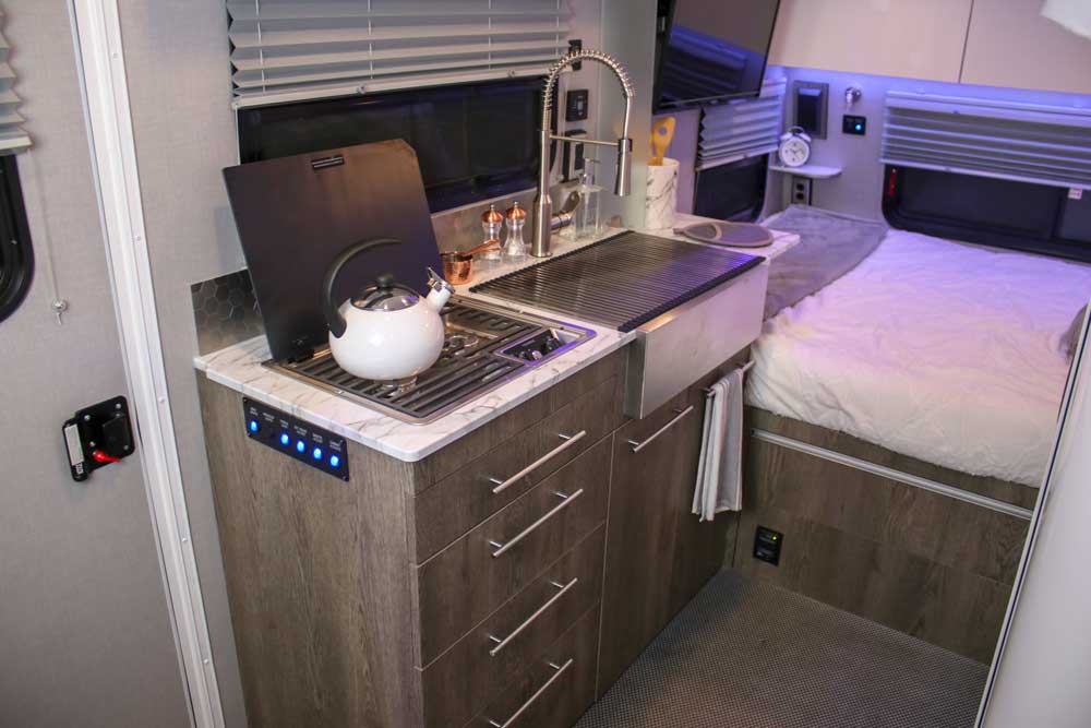 Like the Luna, the Sol features front-wraparound, three-ply tempered glass, akin to an automotive windshield. Inside, however, is 6½ feet of headroom, along with Infinity flooring, a stainless-steel farmhouse sink, a stove with cast-iron grates, a 4.3-cubic-foot refrigerator and a microwave.
