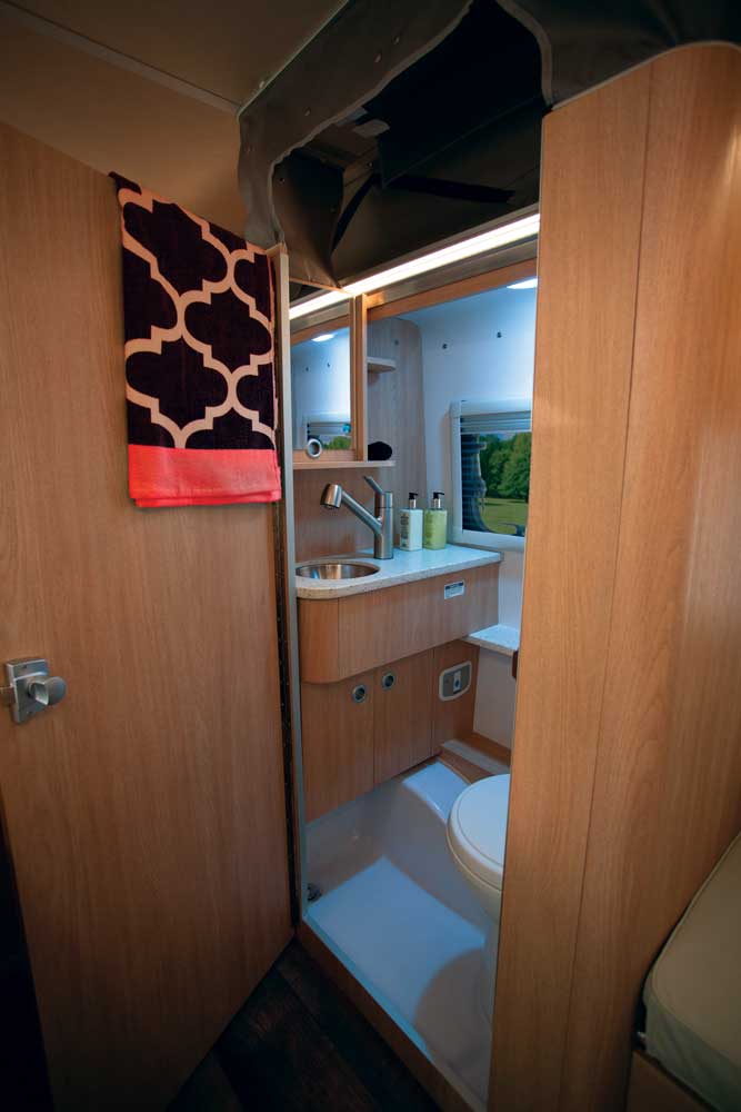 Up front, the Euro-style Sol features a wraparound dinette booth that provides optimum viewing through the windshield, while the rear is home to a queen-size bed with storage beneath. The Sol also offers a wet bath “that’s larger than anything you’ll find in this size unit,” according to inTech Director of RV Operations Rich Schnippel. “It feels more like a dry bath,” he said.