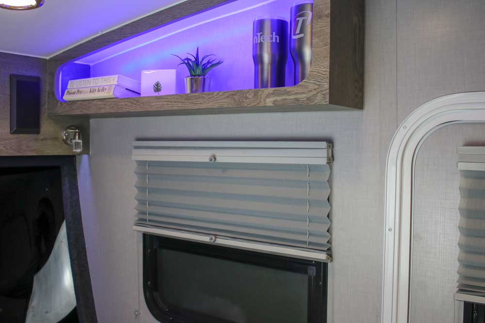 Other than the floorplan and two choices of decor, everything in the Nest comes standard, including Italian Lite-Ply laminated cabinetry, soft-touch panels and accent walls, Bluetooth-controlled LED lights, USB ports and 120-volt AC outlets, two-burner cooktop, two-way refrigerator and powered patio awning.