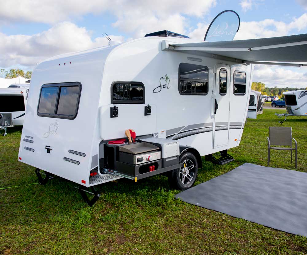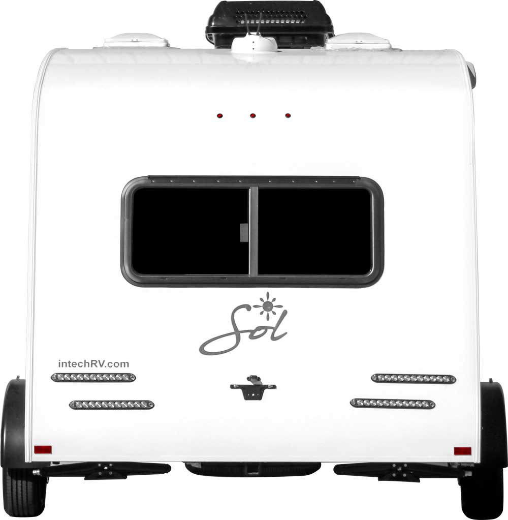 Thanks to its forward-leaning configuration, the Sol, which stretches about 20 feet from bumper to hitch, offers about 16 feet of interior space, well beyond its 13-foot floor footprint. Built on a full-perimeter frame with inTech’s aluminum cage, the 3,200-pound (dry) trailer is expected to carry a base MSRP of less than $30,000 and, added Schnippel, will eventually be offered in premium and off-road versions.