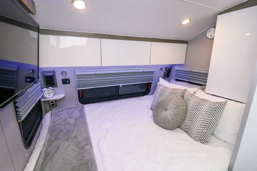 The flagship HQ19, stretching just short of 30 feet, is outfitted like all other Black Series trailers (with the exception of the Dominator pop-up) with wood-finished cabinets, a TV, microwave, three-burner outside kitchen, refrigerator, porcelain toilet and even a small washing machine in the bathroom. It also has twin 150-watt solar panels and two deep-cell, 100-amp 12-volt batteries, an inverter, Dometic roll-out awning, dual LP-gas cylinders, a 16-gallon filtered tank for drinking water and a 50-gallon potable-water tank for supplying all other uses.