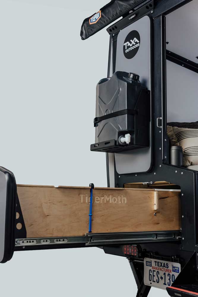 With a pop-up roof that provides 6 feet, 7 inches of interior height, the 12-foot, 5-inch Tigermoth has sleeping space for two adults and one child. A slide-out drawer in the rear holds an optional camp kitchen, with a jerrican mounted above it for storing water. The trailer has no plumbing or holding tanks.