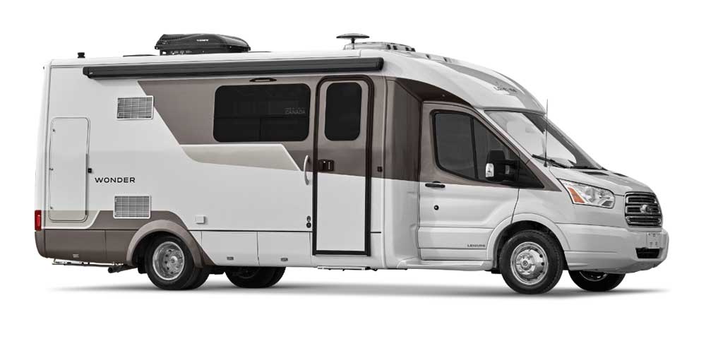 The Wonder Front Twin Bed (FTB) is Leisure Travel Van’s new Class C featuring a front twin-bed design that allows owners to customize their sleeping configuration. The W24MB features two 32-by-76-inch twin beds that can also slide together to form a single bed that’s wider than a residential queen. The beds double as the seating area and offer a great view of the swing-out 28-inch LED TV with Bluetooth sound bar and Blu-ray player. The galley is located amidships and has been outfitted with a two-door 6.7-cubic-foot fridge and convection microwave, allowing for plenty of storage space on the large solid-surface countertop. The large rear bathroom includes a 30-by-32-inch enclosed shower, making it easy for two people to prep for a night on the town. Interior storage is impressive, with ample European-style cabinets galore featuring accent doors designed to be scratch-resistant, anti-fingerprint and even antibacterial. The Wonder rides on the Ford Transit cutaway chassis and is powered by a 3.2-liter Power Stroke turbodiesel. The vehicle features contoured side walls, a fiberglass flex roof, and integrated front and rear fiberglass caps.