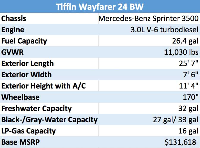 Yes, you read that right. Tiffin, long known for its quality Class A motorhomes, recently entered the Class C market with the introduction of the Wayfarer. Built on the Mercedes-Benz Sprinter chassis, the Wayfarer 24 BW is highlighted by the large rear bedroom, which sports a queen bed with memory foam mattress, two deep nightstands and two wardrobes, with plenty of space to walk around. There’s also an optional entertainment center or bunk-bed configuration. The split bathroom puts the 32-by-34-inch shower curbside, while lav, sink and overhead storage are streetside. The fully equipped galley offers a sink, two-burner stovetop and microwave, plus a 5-cubic-foot gas/electric refrigerator. Thoughtful appointments like on-demand hot water, solid-wood curved cabinetry, LED lighting and Spyder multiplex wiring, speak to Tiffin’s tradition of upscale amenities inside, while the exterior features two seamless slideouts to help prevent leaks, a fiberglass roof, Durashield Titan rock-chip protection and full-body paint to round out the look of luxury while increasing longevity. An exterior TV takes care of campsite entertainment, while a standard 3.2-kW diesel generator keeps the power flowing. The Wayfarer is equipped with SumoSprings ride assist to help smooth out the bumps. The standard Driver Assistance Package provides lane-keeping assist, collision prevention and high-beam assist. And, at less than 26 feet in length, the Wayfarer is easy to drive and handle on the road or in camp.