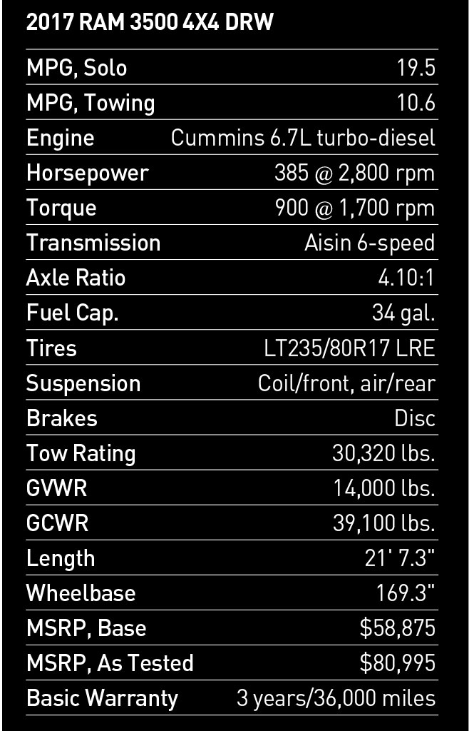 Since the Momentum tipped the scales at 16,780 pounds with water and LP-gas, the Ram turned out to be a valuable partner for the combo. The 2017 Ram is identical to the 2018 model year with the exception of an increase in torque to a class-leading 930 lb-ft for the venerable 6.7-liter Cummins diesel engine. Tied to the Aisin six-speed transmission, the truck easily lived up to its 30,320-pound tow rating and handled the Momentum with grace and style. The optional auto-leveling air-ride suspension civilized the ride, which was certainly welcome when tooling around solo on some of the ragtag roads we experienced.