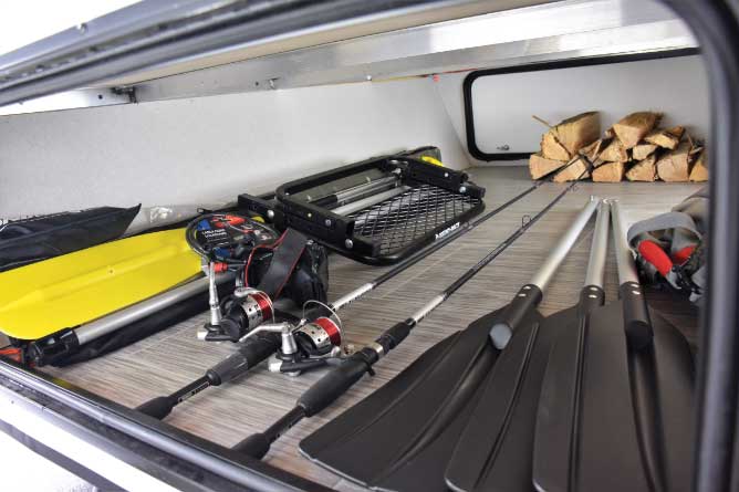 The No Boundaries lineup, or NoBo for short, introduced last fall with three floorplan series measuring 10, 16 and 19 feet, was created for RVers looking for a lighter trailer that accommodates plenty of outdoor equipment. To that end, all NoBo trailers, even the largest ones, have a gross vehicle weight rating (gvwr) of less than 5,000 pounds.