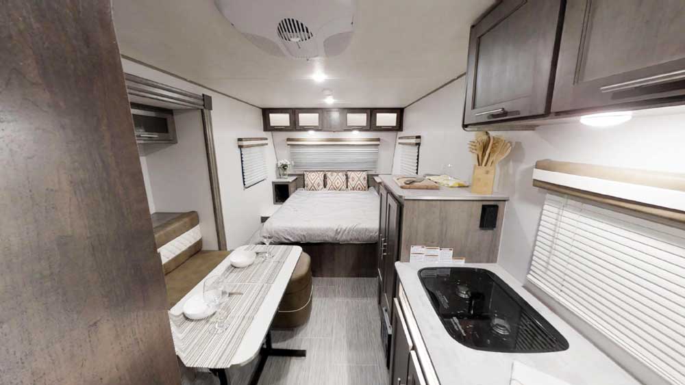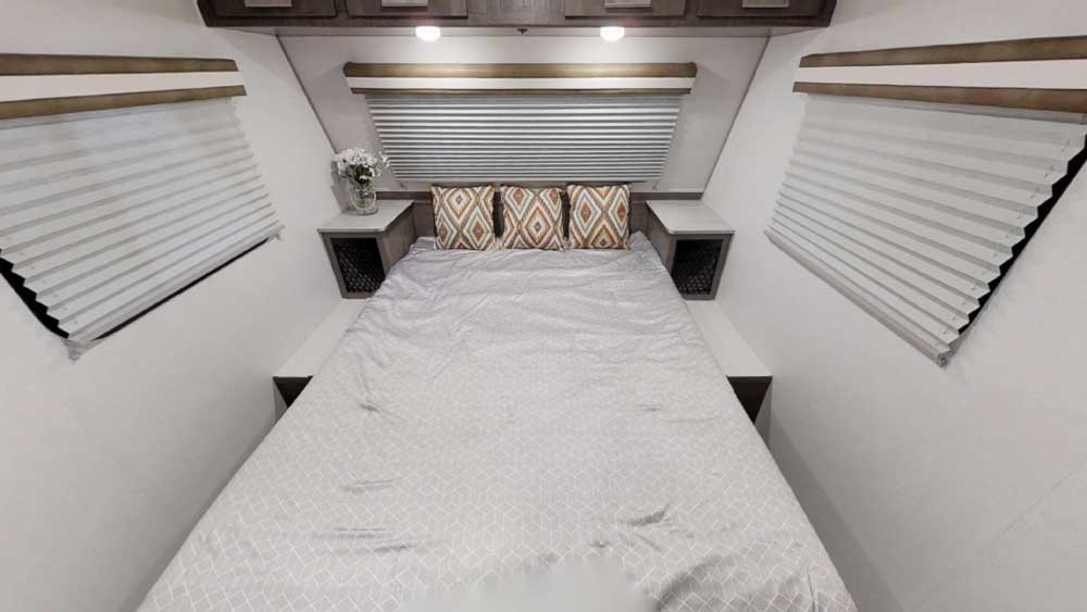 The dinette converts into a bed that reportedly sleeps two, but it’s a tight fit for most adults, so extra-small people or children would be appropriate for that bed; the queen bed at the front is right-sized for adults. Great news for picky sleepers: This is a full 60-by-80-inch queen bed, which makes it easier to swap out mattresses, if you desire, plus each side has its own nightstand and storage cabinet with an outlet. Under the bed is access to the pass-through basement storage.