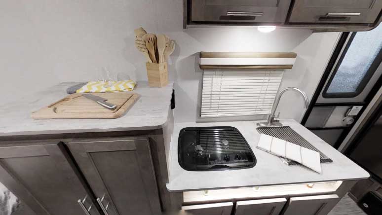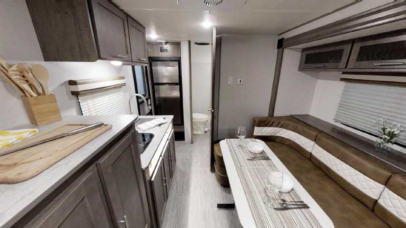 Once dinner is prepared, Forest River has created what it calls a “chaise lounge dinette” in place of a standard booth setup, with seats that curve at the far ends, and removable ottomans with storage inside. The freestanding table is narrow, and people sitting at the curves will undoubtedly bang knees. There’s also a shelf behind the seats, which I appreciated, and more overhead cabinets. The seats themselves are cushy and comfortable without being easily crushed. These seem like they’ll stand up to use and weight.