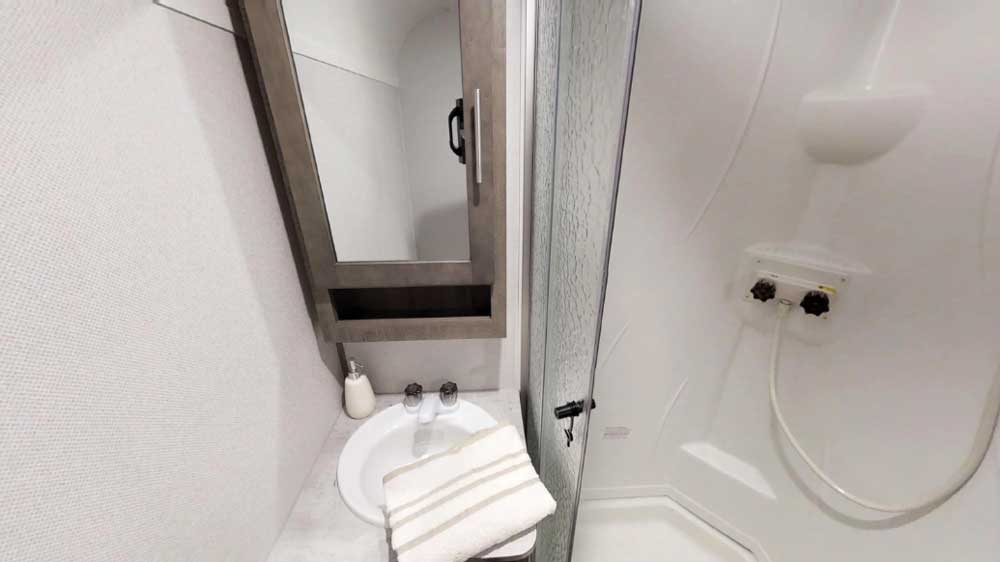 Another bonus in the 19 Series NoBo trailers is the full dry bath. Here, there is a toilet with a sink, storage, a mirrored medicine cabinet and a real radius-corner shower. A waterproof LED fixture is close enough to the shower enclosure to cast some light in at night when there’s no sunshine to help illuminate it through the skylight.