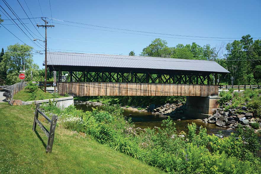 Edna Surridge of the Lancaster Visitors Center provided directions to the two other area bridges. Take Elm Street west from Route 2, opposite Mechanic Street. Follow the narrow, winding road for 5 miles (passing an odd Stonehenge-like rock formation along the way) to the one-lane 1911 Mount Orne Bridge just west of State Route 135. Also called the Lunenburg Bridge, the 266-foot-long Howe truss structure crosses the Connecticut into Lunenburg, Vermont. (Note: You can’t drive your RV across the covered bridges, and turning around at some can be tricky, so be sure to plan ahead.)