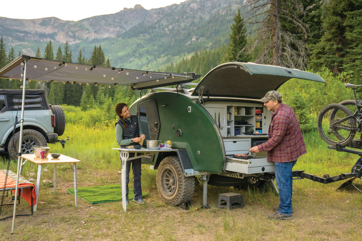 Inside, the Rubicon includes a jackknife sofa, wall-mounted A/C, and plenty of shelf space, plus a few surprises, including a pop-up power station for charging electronic devices, optional solar prep, and even an electric fireplace to take the chill off those cold winter nights. But the 1200RK shines with its cleverly designed rear kitchen, which allows you to enjoy the surrounding views while preparing meals in the exterior galley using the 4.5-cubic-foot fridge, sink, and griddle beneath the protective rear hatch.