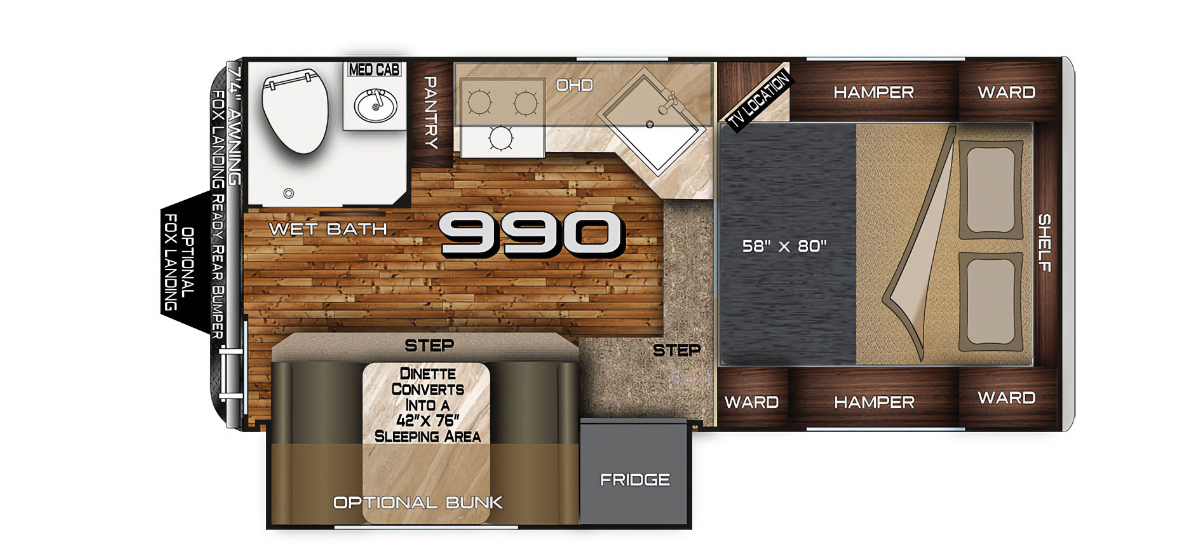 But now they also get the 990’s first-ever aerodynamic fiberglass front cap, Furrion 8-cubic-foot 12-volt stainless fridge, 400 watts of solar, thermal pane windows, and rearview camera prep with the option to add a system at the factory.