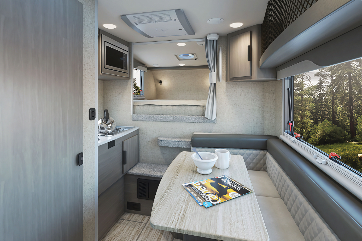 A two-seater dinette below the 60-by-74-inch north-south cabover bed converts into additional sleeping space. Rounding out the amenities are a wet bath, tankless water heater, 12-volt fridge, 13,500-Btu A/C, and storage galore, including on both sides of the bed. Solar panels and a controller are standard, and there’s an outside shower.