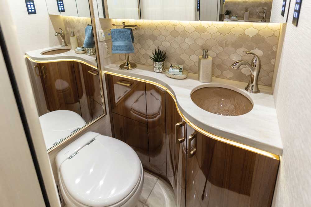 Blend in the elements that exude pure comfort and owners will relish hanging out inside — and entertaining guests. Of course, many of the owners don’t cook elaborate meals, so the galley will be considered on the small side when compared to some mainstream diesel pushers. Stove and sink inserts extend the versatility of the solid-surface countertop and a practical selection of drawers and cabinets handles storage for a well-equipped kitchen.
