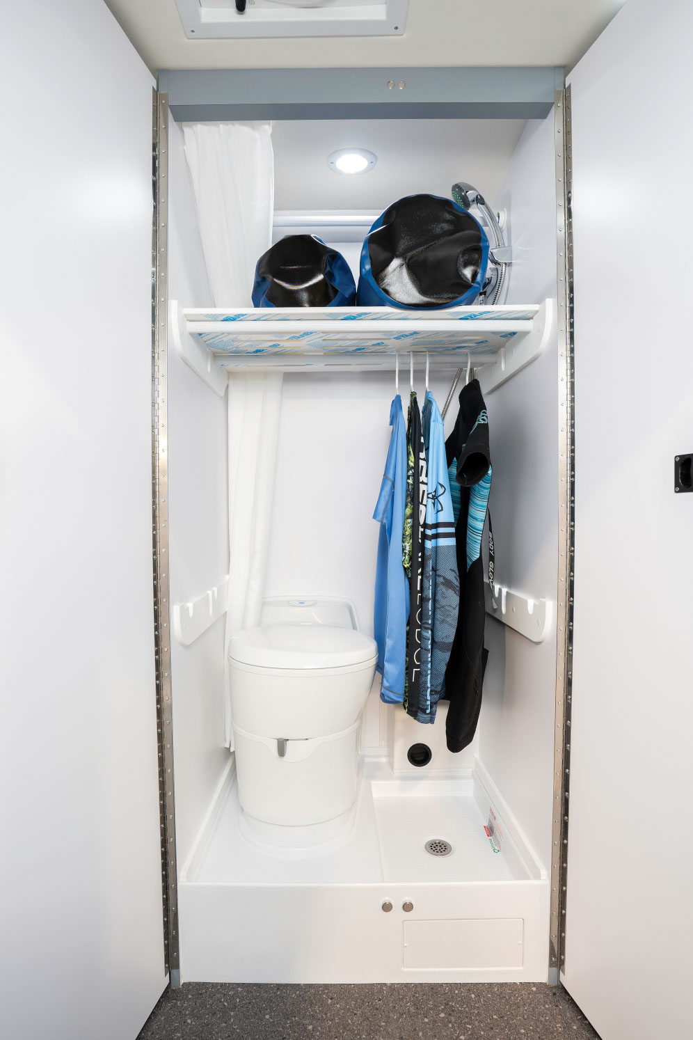 Versatility, Plus! The dual-function wet bath/gear locker includes a shower rod and 5-gallon cassette toilet, plus a removable shelf and closet-rod storage system.