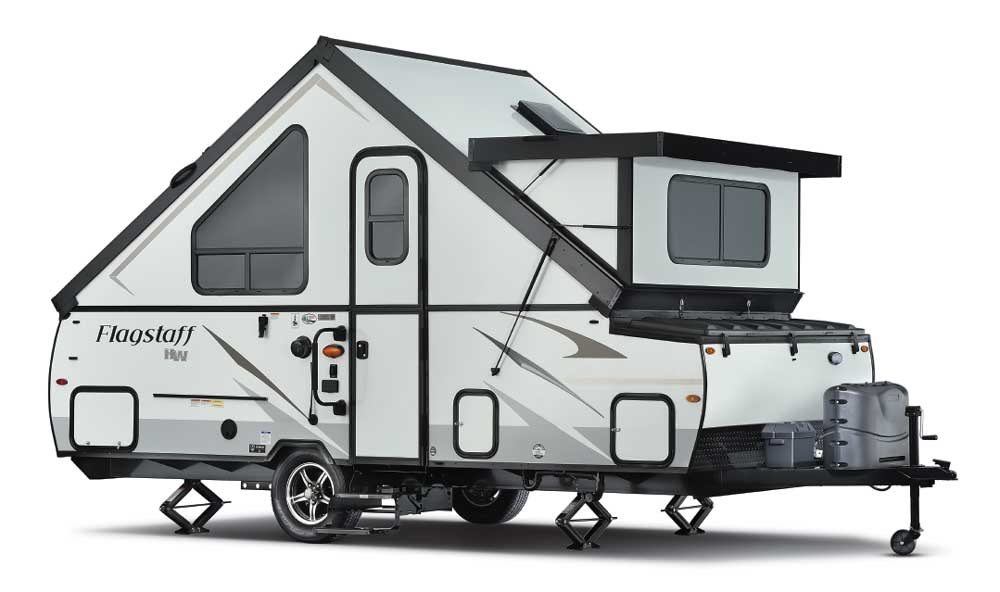 Like its sister manufacturer, Rockwood, Forest River’s Flagstaff brand offers nine A-frame models. The nearly 21-foot Flagstaff T21DMHW delivers more floor space than the Rockwood A122BHESP, and the headroom-extending front dormer is standard.